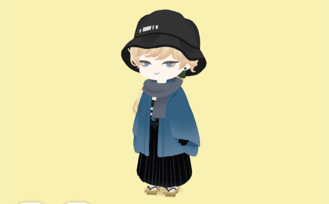 和装に帽子とマフラー、和洋折衷な出で立ち。